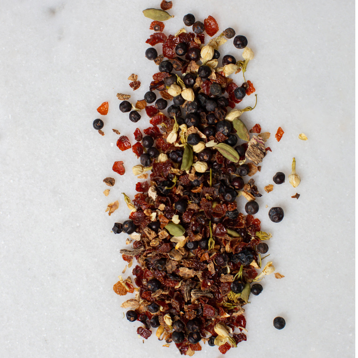 Rose Hips, Juniper, Cardamom, Lemon Peel, Jasmin Flowers, Angelica Root