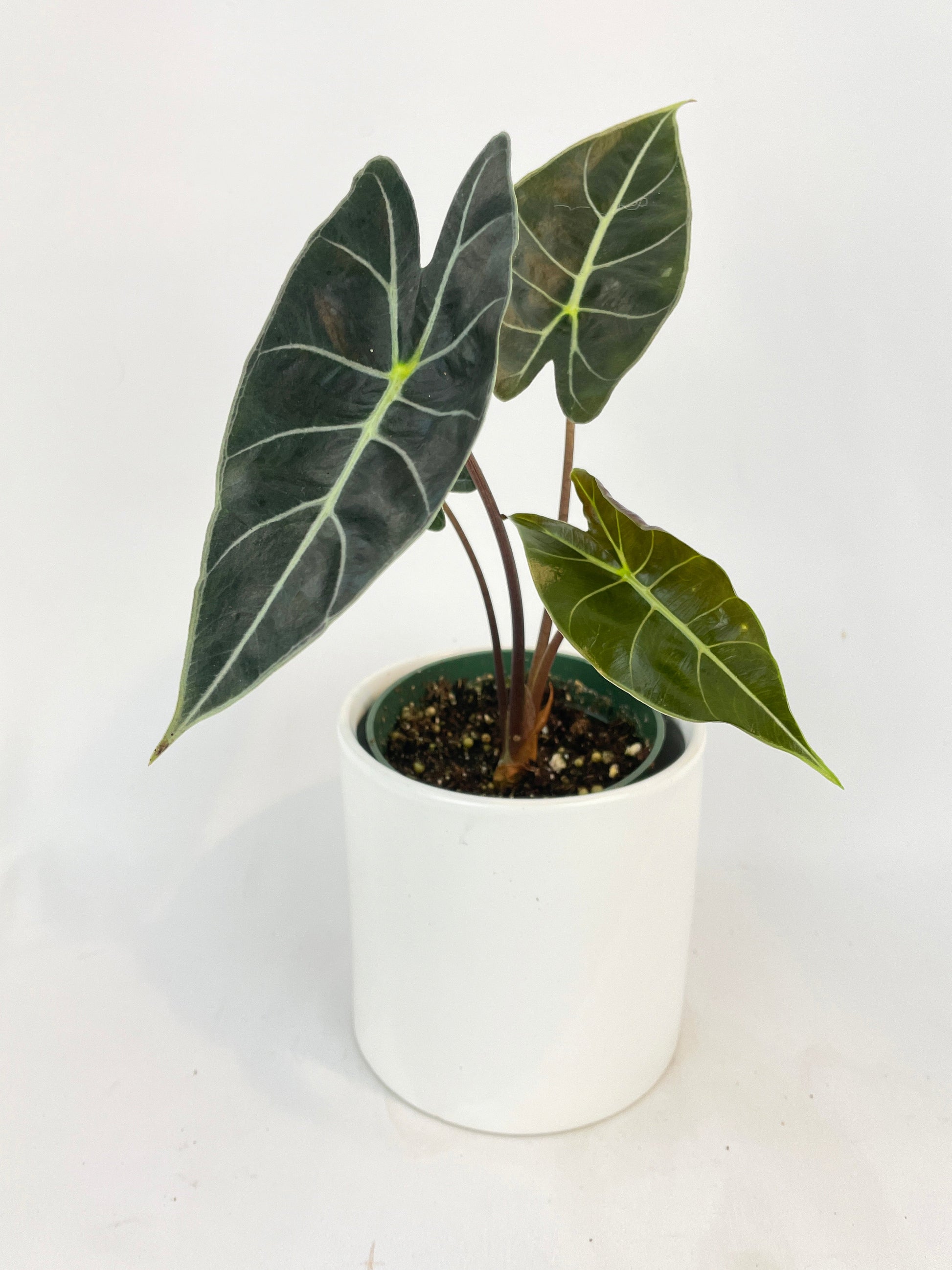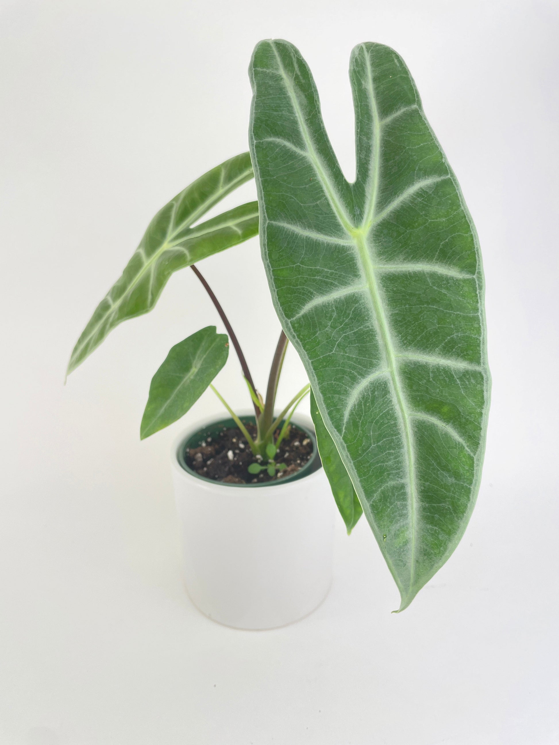 Alocasia Dragon Tooth or Alocasia Longiloba is a rare tropical houseplant with dark green pointy leaves. This plant is rare and has striking white veins. The surface of the leaves are glossy and shiny. Alocasia Longiloba prefers high humidity, moist well-draining soil, and bright indirect light.