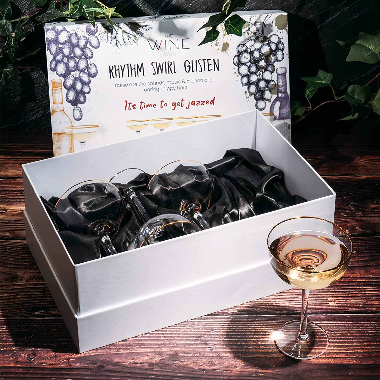 - The elegant design will have you feeling like royalty. A Set of 4 Vintage Champagne Coupe Gold Rim Goblet Glasses 7oz by The Wine Savant, is a beautiful way to complete any bar. These are great for any event: Wedding Party, Anniversaries, Cocktail Party, Martini's and more. This design will give a touch of elegance to your next classic party. Your friends will surely enjoy drinking out of these glasses that are made with high quality borosilicate glass.