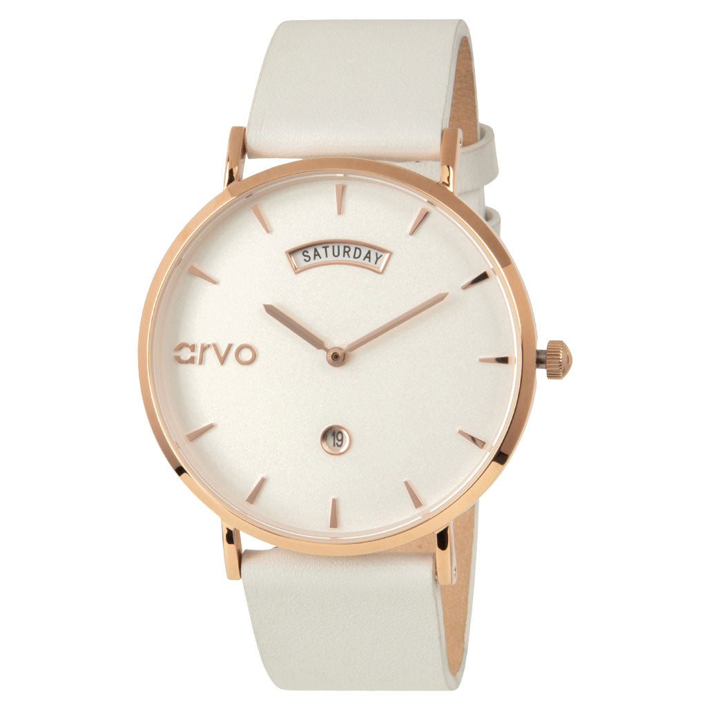 Arvo Awristacrat rose gold watches for women are a statement in style and class. The upgraded stainless steel casing and backplate offer durability while maintaining a slim profile. We've added a white leather watch band to set it off!