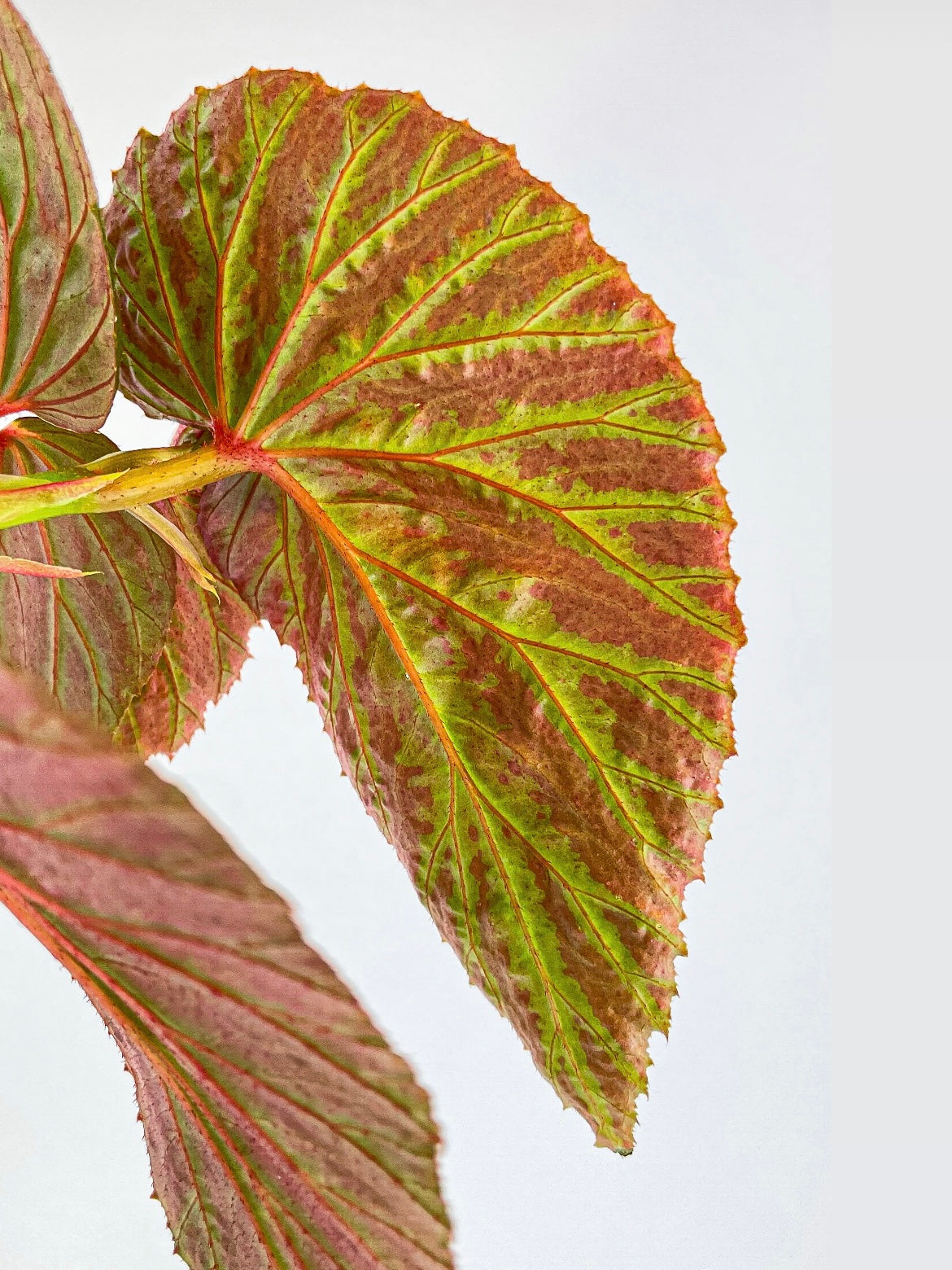 Begonia brevirimosa exotica is a rare exotic plant with showstopping foliage. This New Guinea species has a shrub-like growth habit and large flashy leaves. It has striking elliptic shaped leaves with dark olive green palette with wide bands of metallic pink. This plant will get tall and as it does will need to be staked. The pink flowers form on a terminal inflorescence. This plant needs extra humidity. It will grow fine in a humid greenhouse or garden room, or it can be grown in a large terrarium.