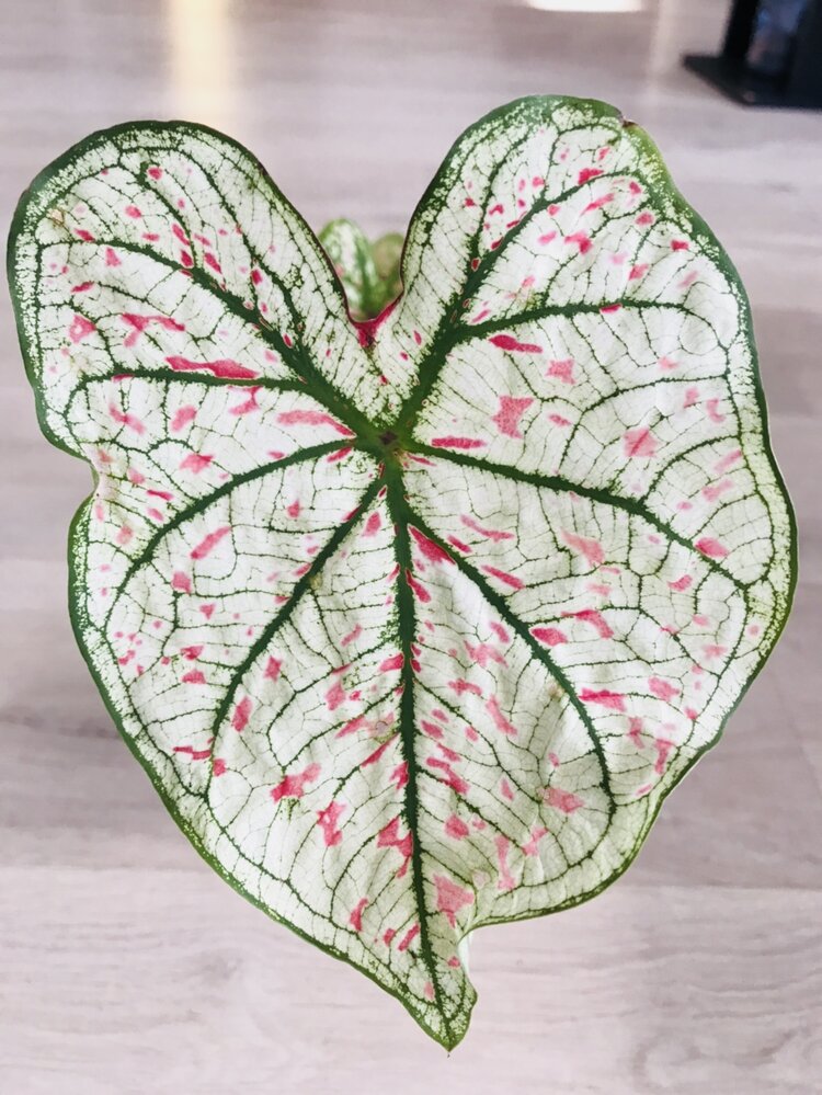 Caladium Marie Moir Pink "Polka Dot" is a rare form of caladium with snow white leaves with bright pink polka dot leaves. The edges and veins of the leaves are green and it runs along the border of the whole leaf.