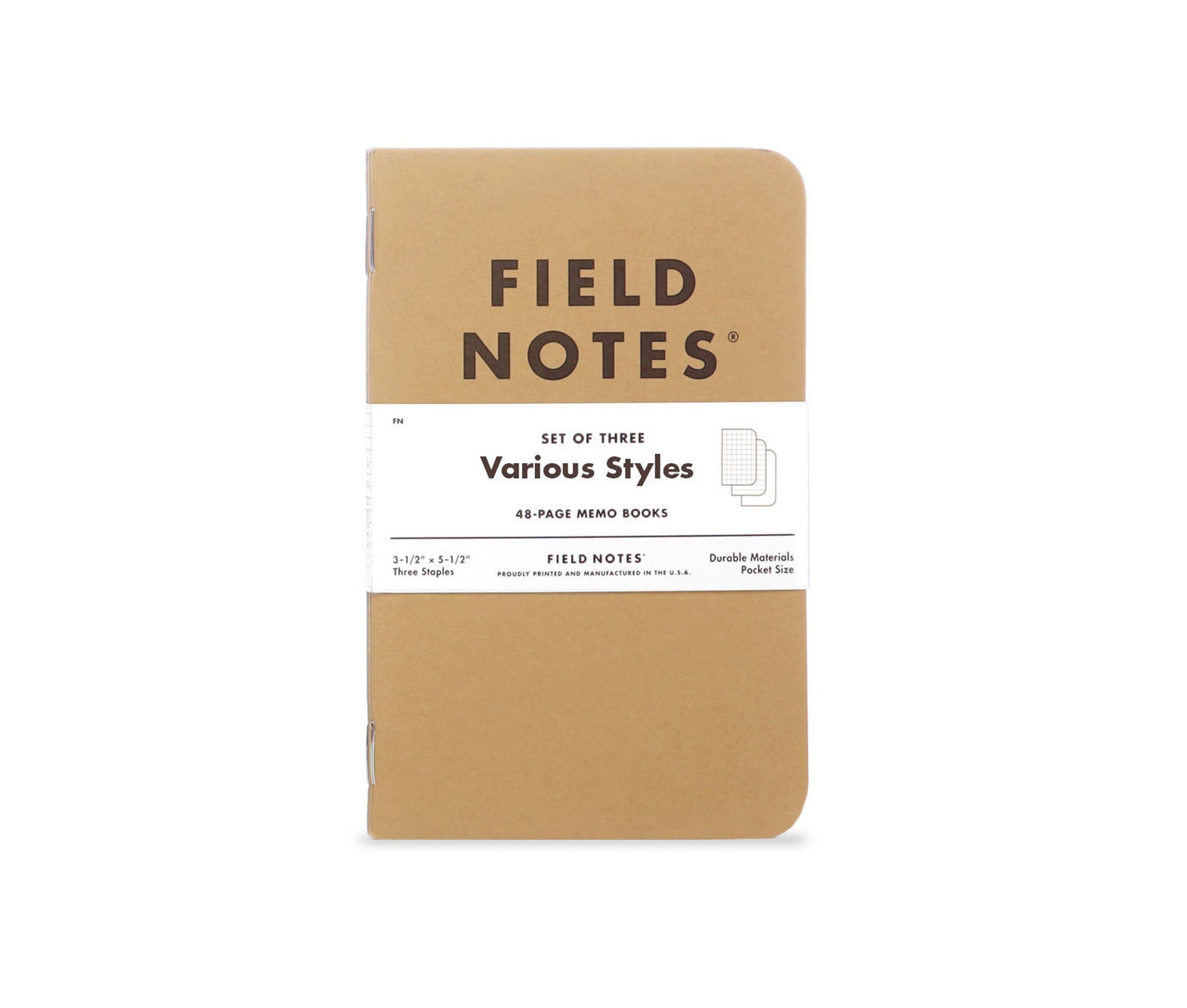 Our field notes 48-page notebooks are available in three variations – graph, ruled, or plain paper – or as a mixed 3-pack that includes one of each paper type. Each Original Kraft memo book measures 3-1/2" wide by 5-1/2" tall and is bound by a rugged three-staple saddle-stitch process.