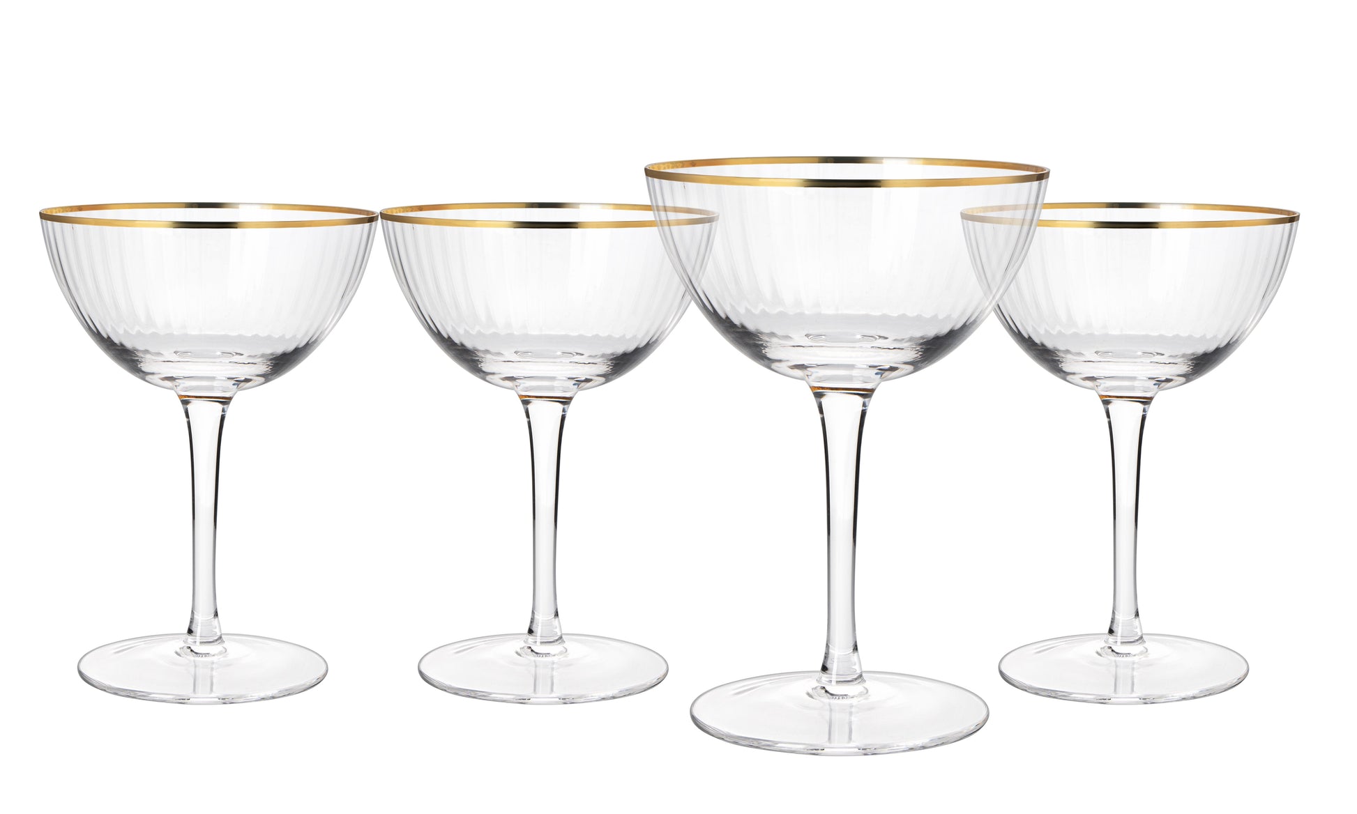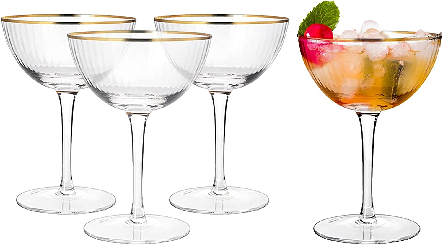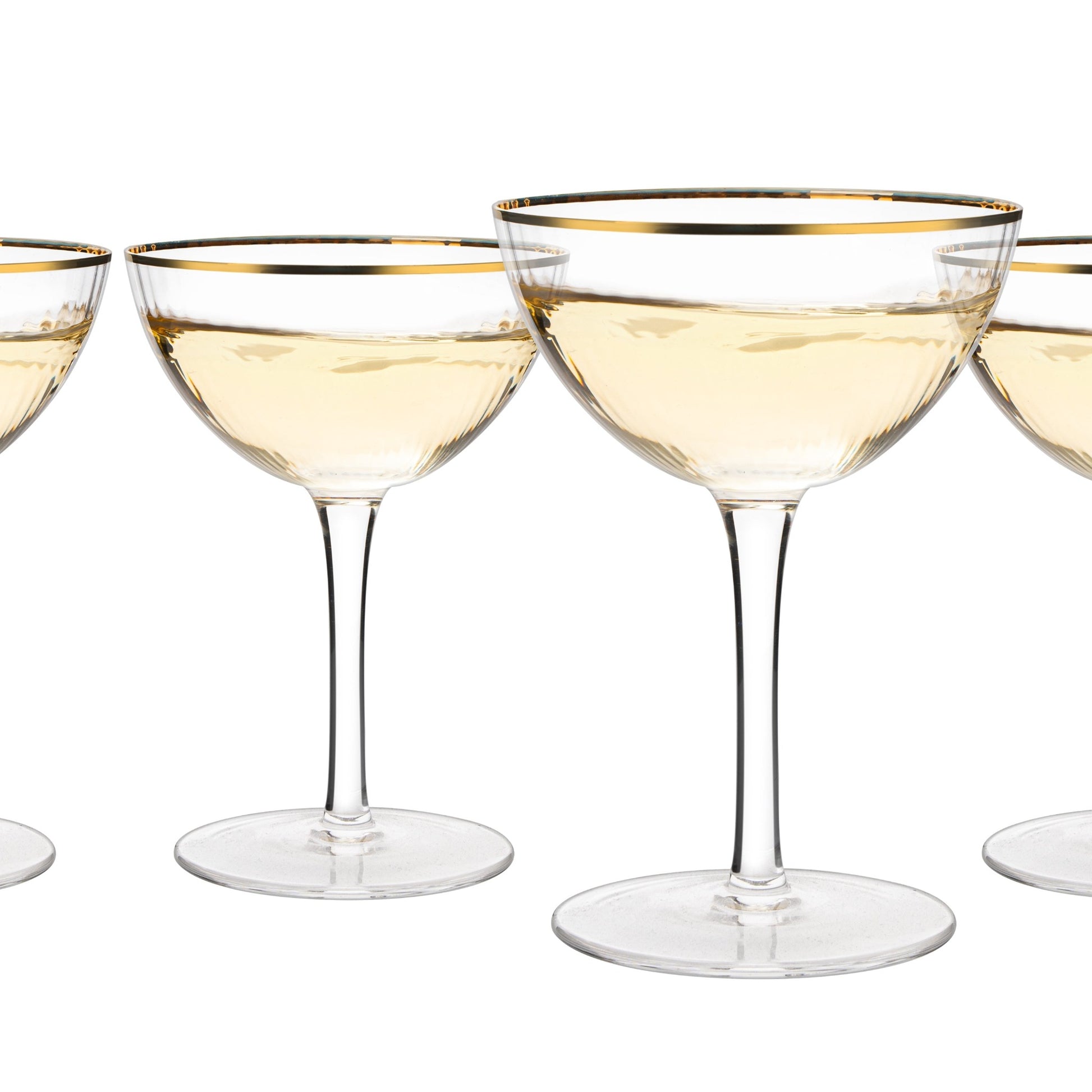 - Add a special touch to your celebration with this set of 4 gold rimmed champagne coupe glasses. The champagne coupe is widely considered to be the most romantic of drinking vessels. So you and your friends are celebrating the special event of a life time. Make it extra special by adding these 4 vintage gold rimmed champagne coupe glasses to the mix! Whether you're sharing a bottle of champagne, wine or cocktails, these classy glasses are sure to impress your guests.