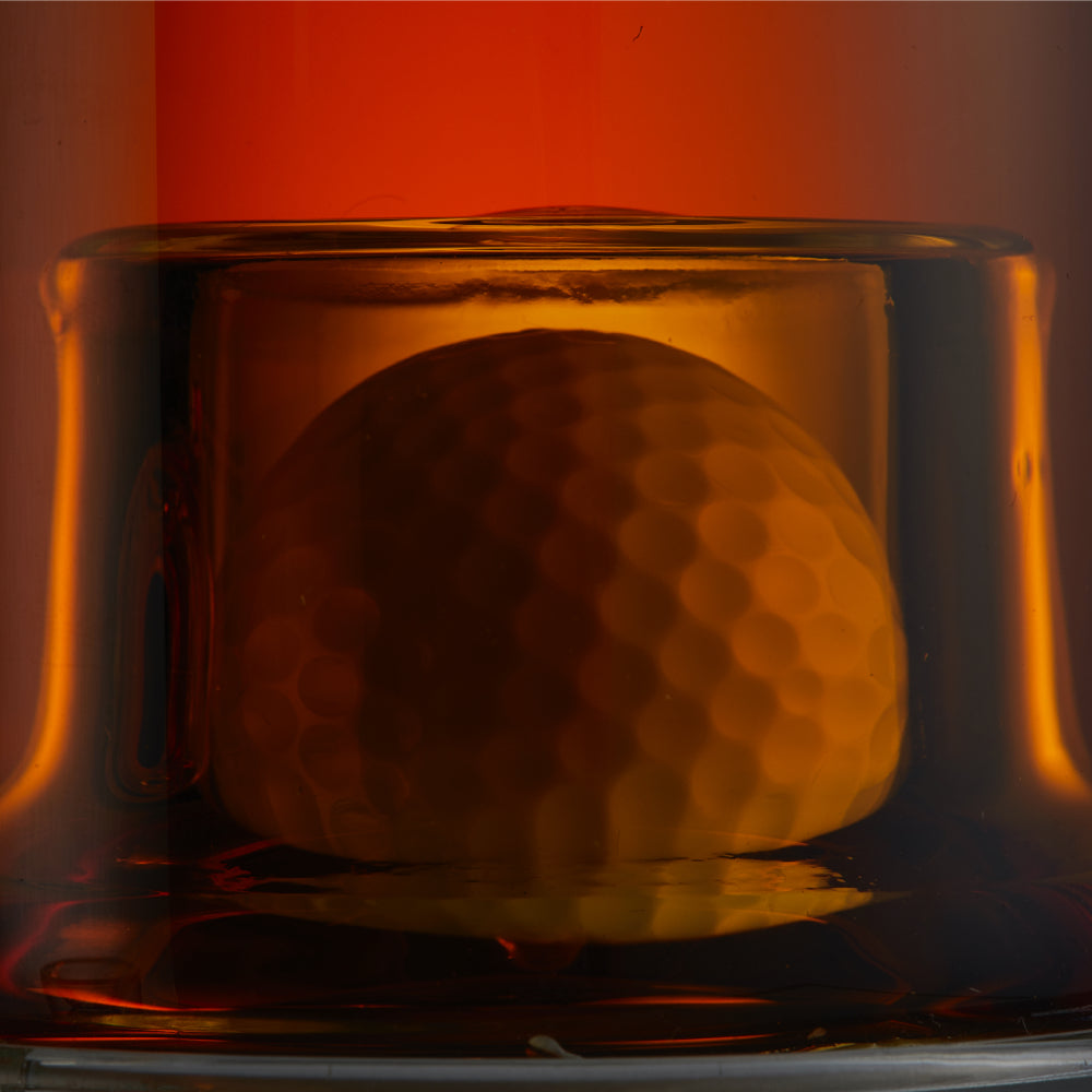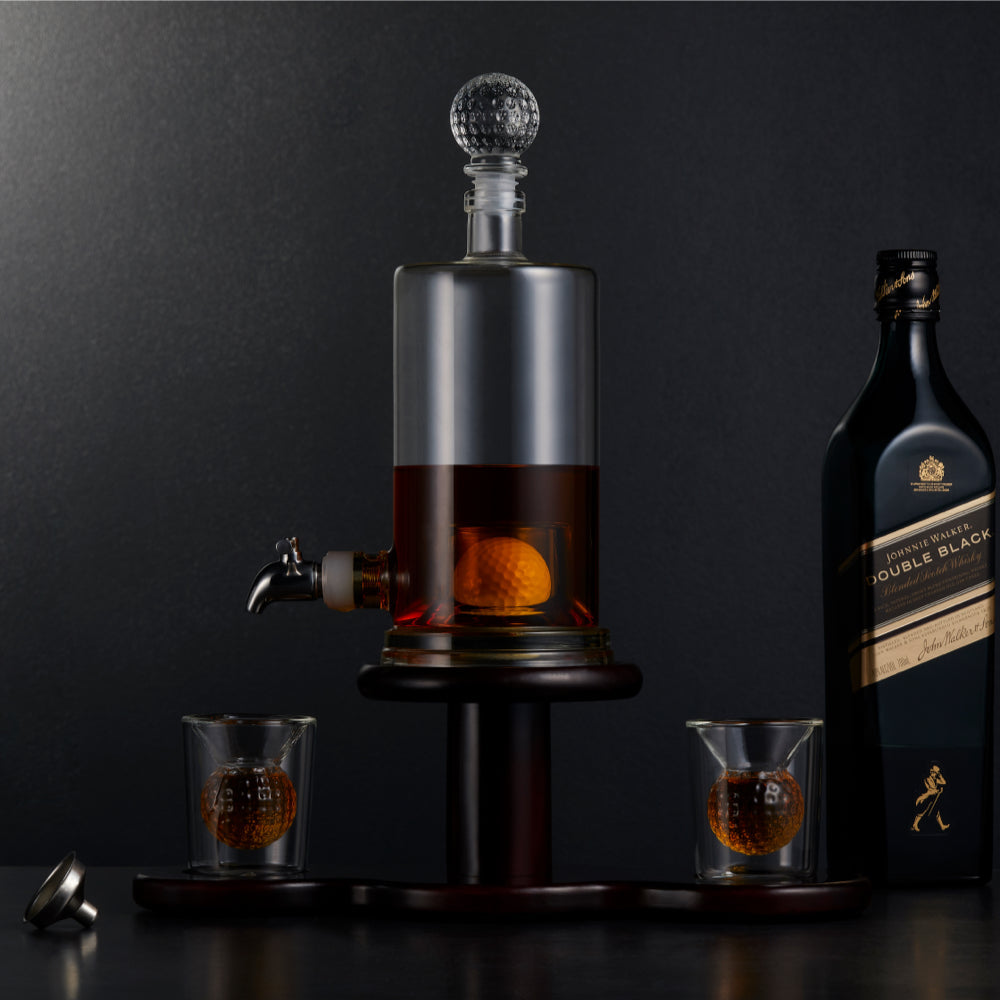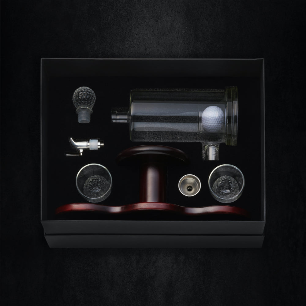- Entirely hand-crafted and includes a Large whiskey decanter with Golf ball engrained inside, gorgeous premium giftbox, rustic wooden display shelf, two golf ball shaped whiskey glasses, pouring funnel and a golf ball shaped glass stopper to keep your whiskey fresh.
