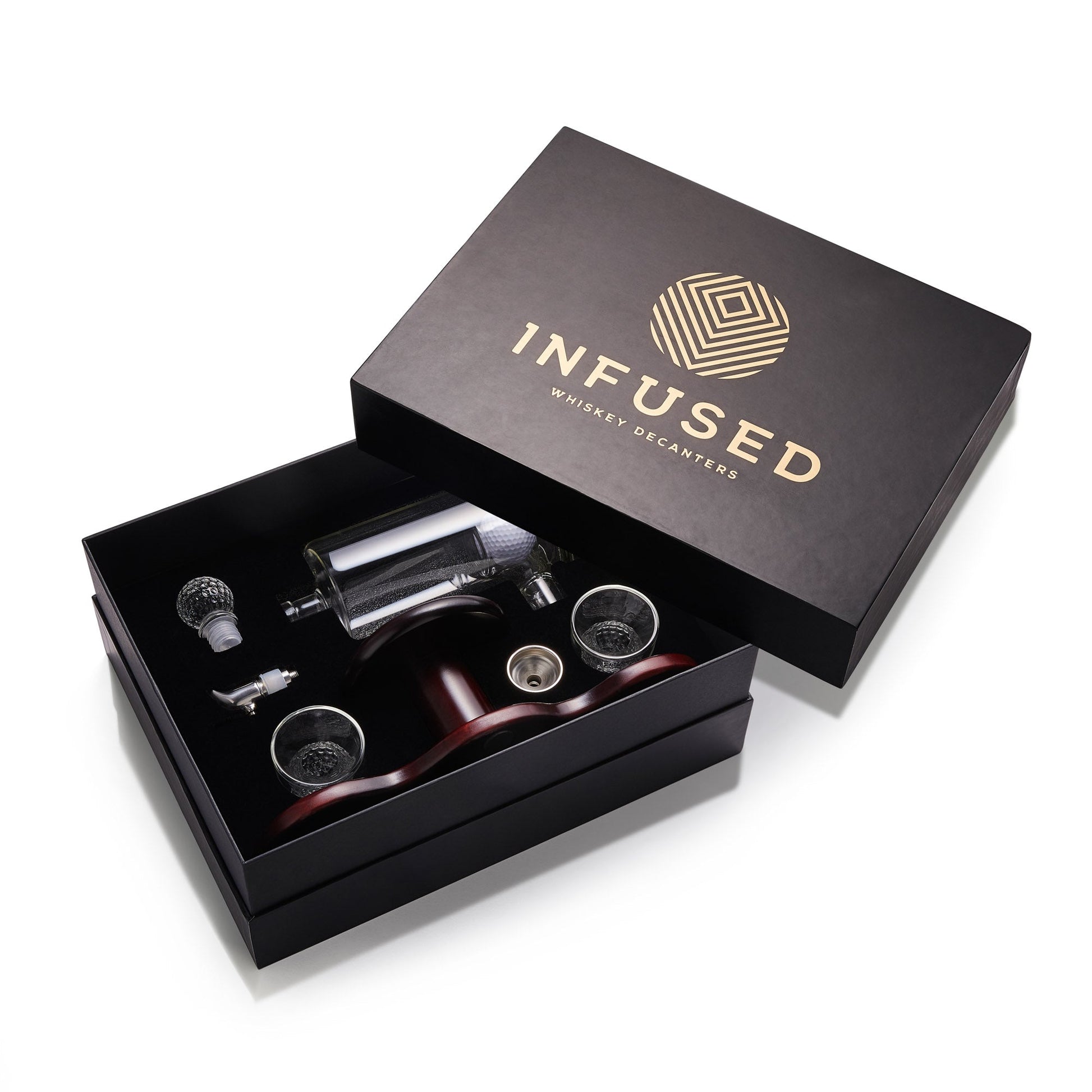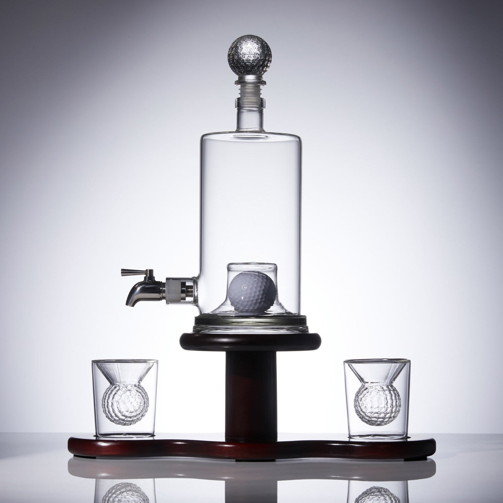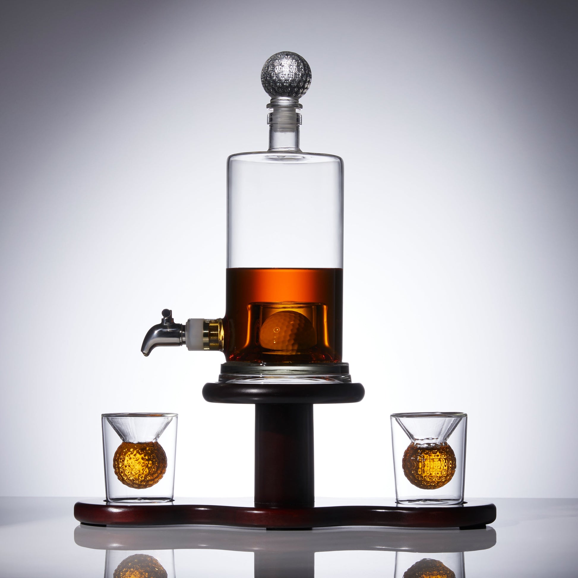 - Entirely hand-crafted and includes a Large whiskey decanter with Golf ball engrained inside, gorgeous premium giftbox, rustic wooden display shelf, two golf ball shaped whiskey glasses, pouring funnel and a golf ball shaped glass stopper to keep your whiskey fresh.
