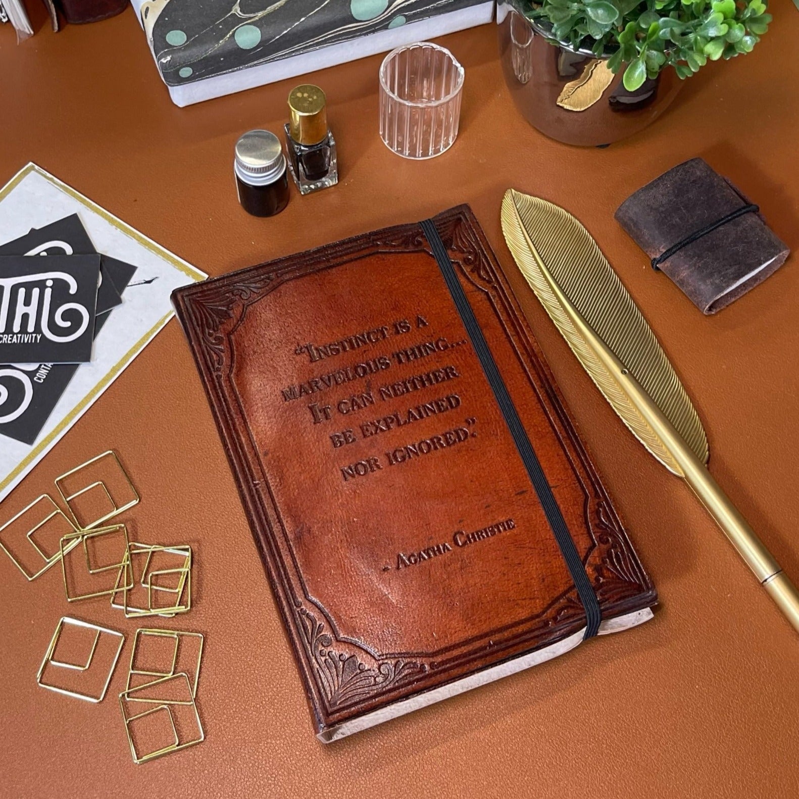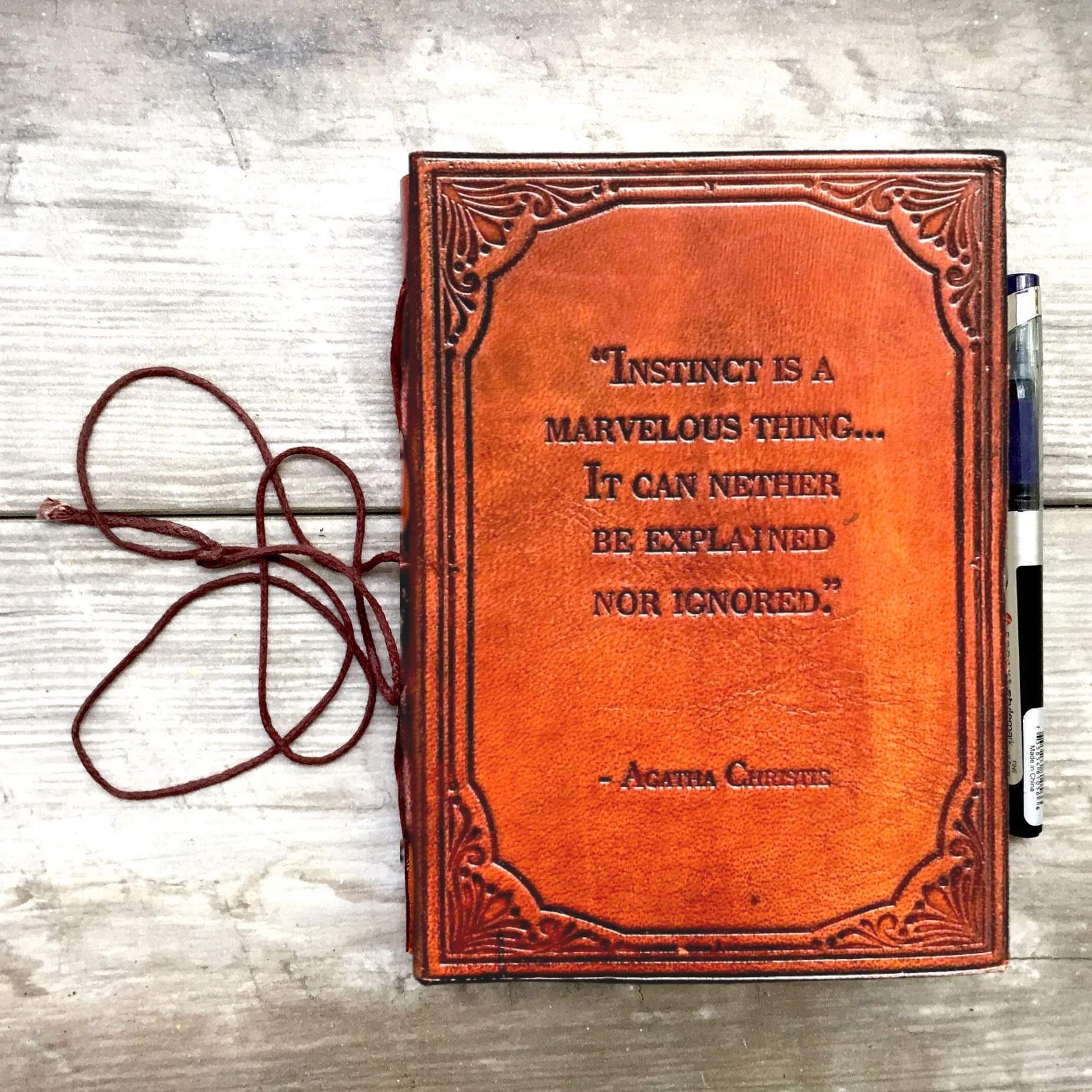 This handmade leather journal is embossed with the following quote by Agatha Christie “INSTINCT IS A MARVELOUS THING...IT CAN NEITHER BE EXPLAINED NOR IGNORED.” It is a perfect journal to gift to your loved ones who love to record everything in a journal to re-live their experiences.