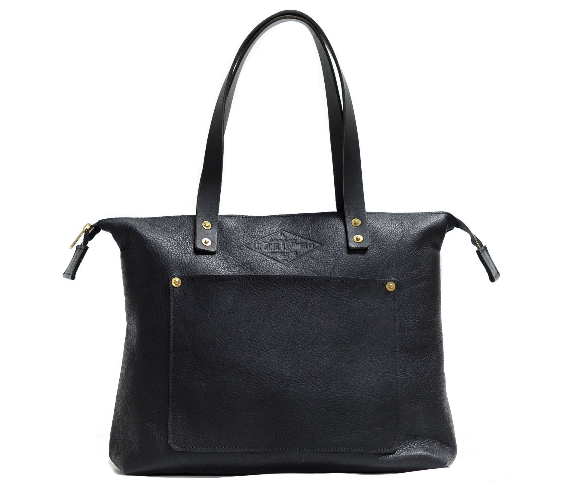 This tote comes a zippered top, an optional front pocket and (2) interior pockets (1 open pocket, 1 zippered pocket). The leather we use on this tote is softer and has a pebbled texture.