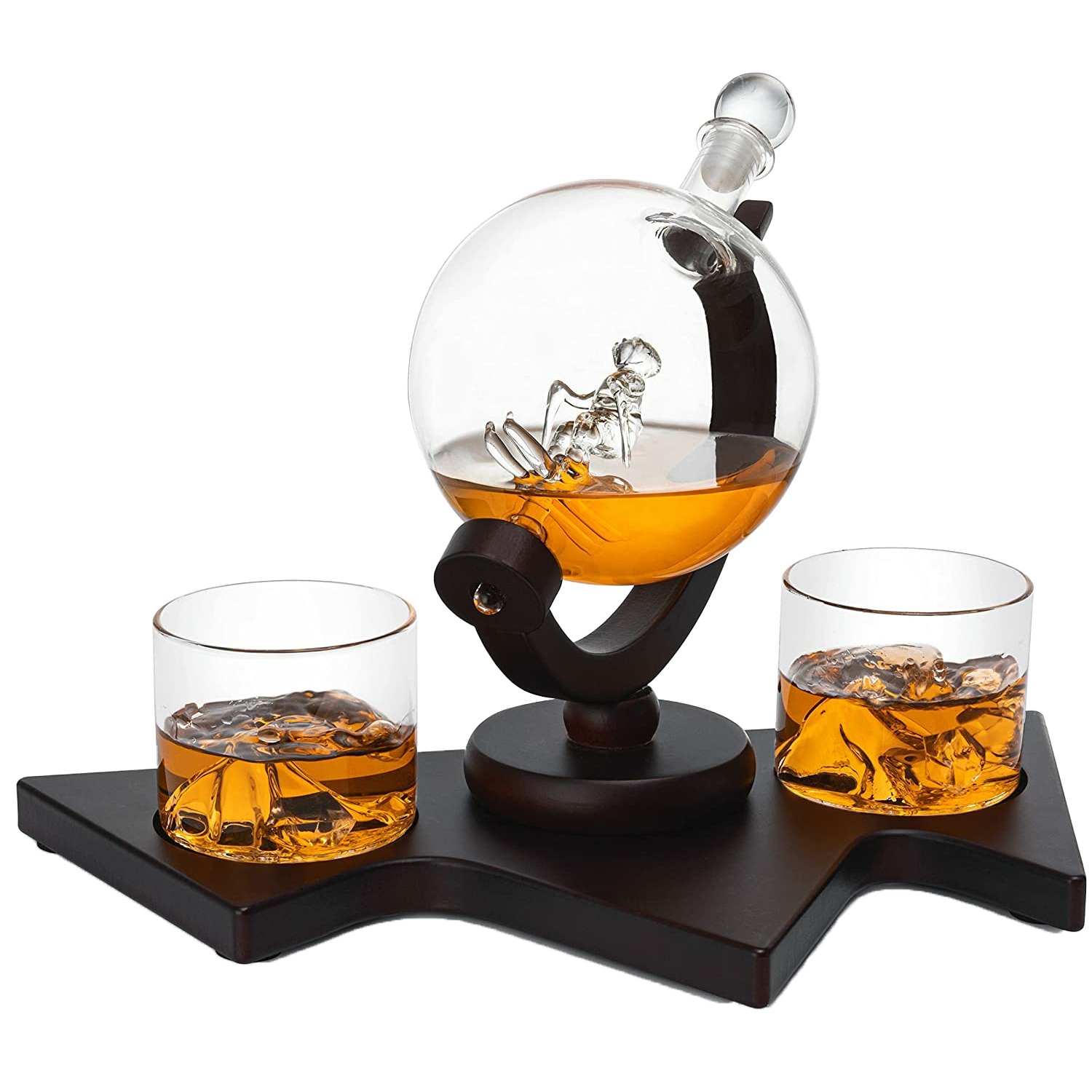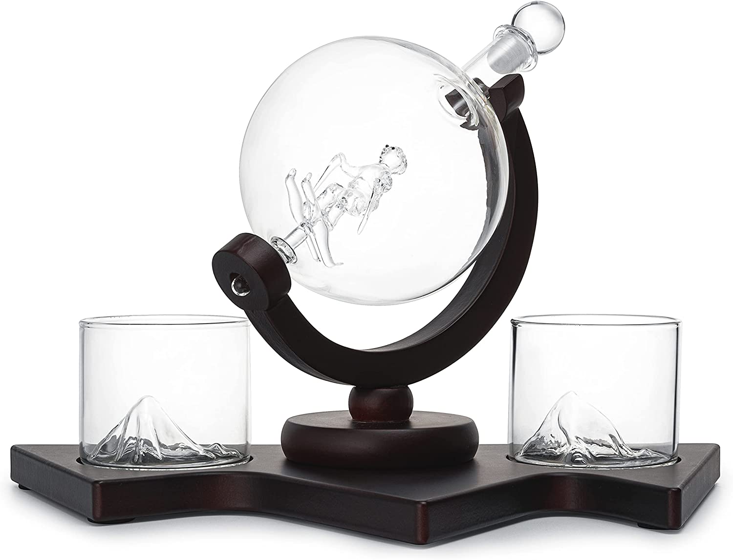 - How will you serve your favorite spirits this season? Hit the slopes in style and impress guests at your next ski party with the elegant Ski decanter set. This innovative 850 ml wine vessel features an expressive skier on the slopes creating the illusion of movement, two 12 oz glasses depicting a glacier, and an 14" elegant mahogany wooden base. Be the life of the party and be the envy of your ski runs with this unique decanter set!