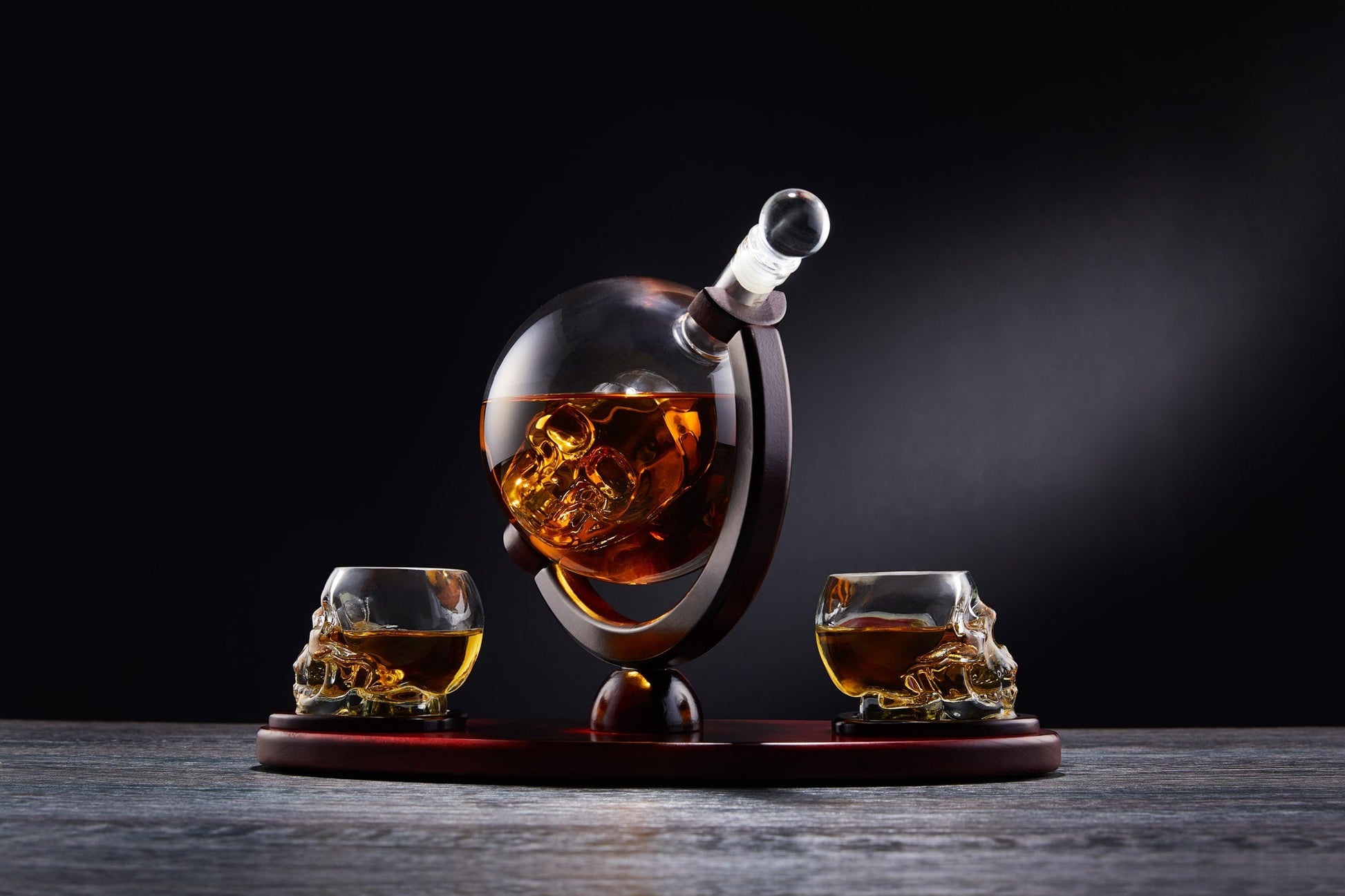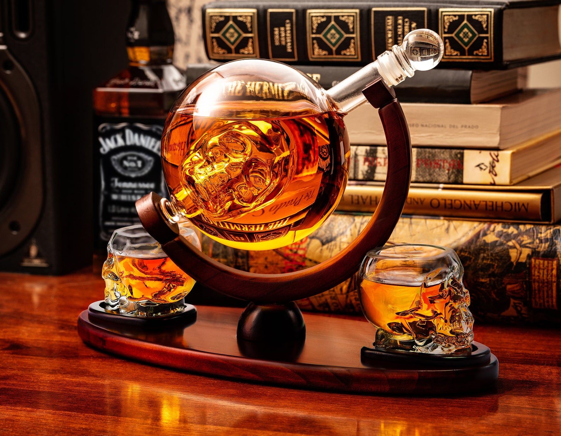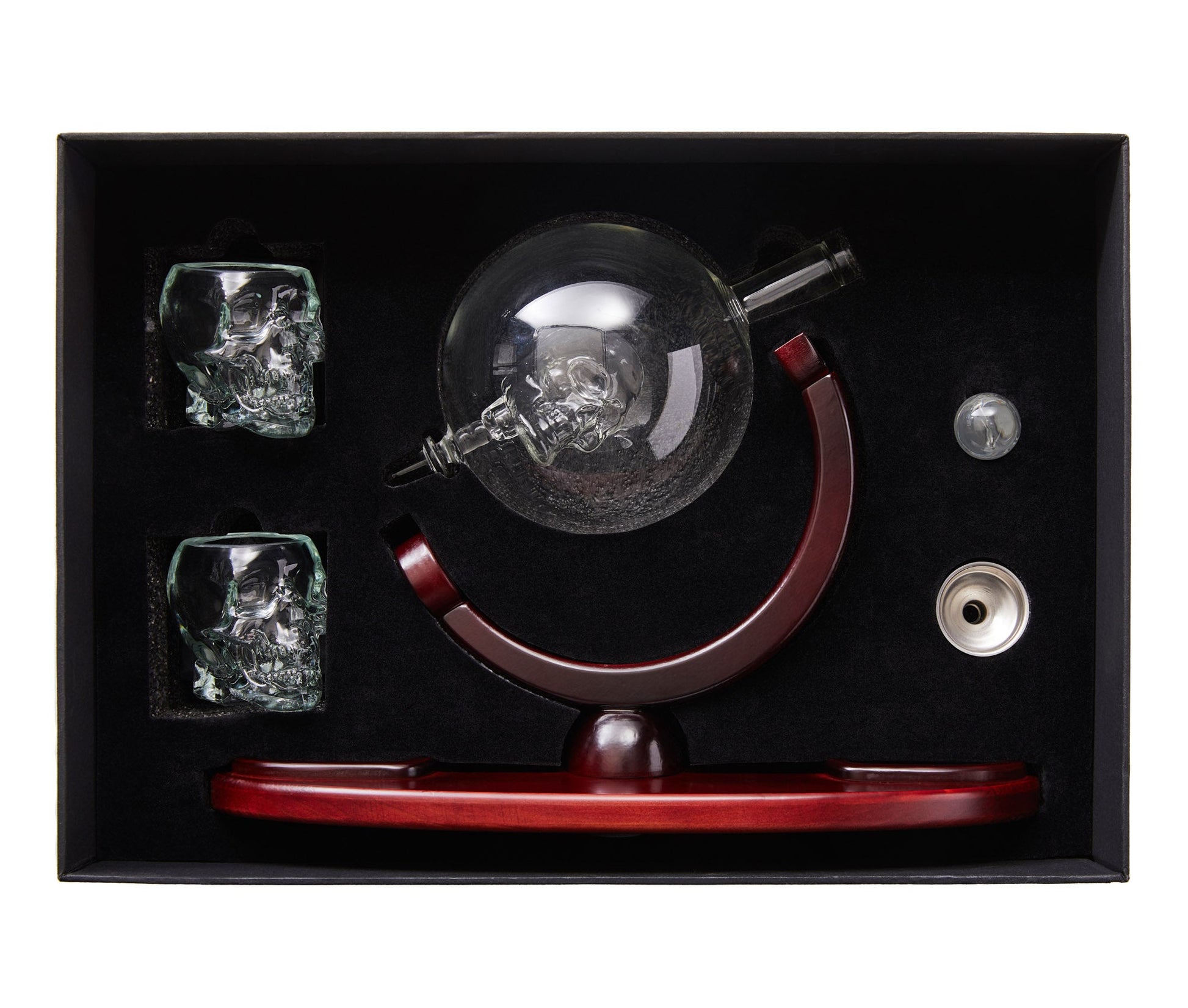 - Entirely hand-crafted and includes a Large whiskey decanter with Skull inside, gorgeous premium giftbox, rustic wooden display shelf, two skull shaped whiskey glasses, pouring funnel and a glass stopper to keep your whiskey fresh