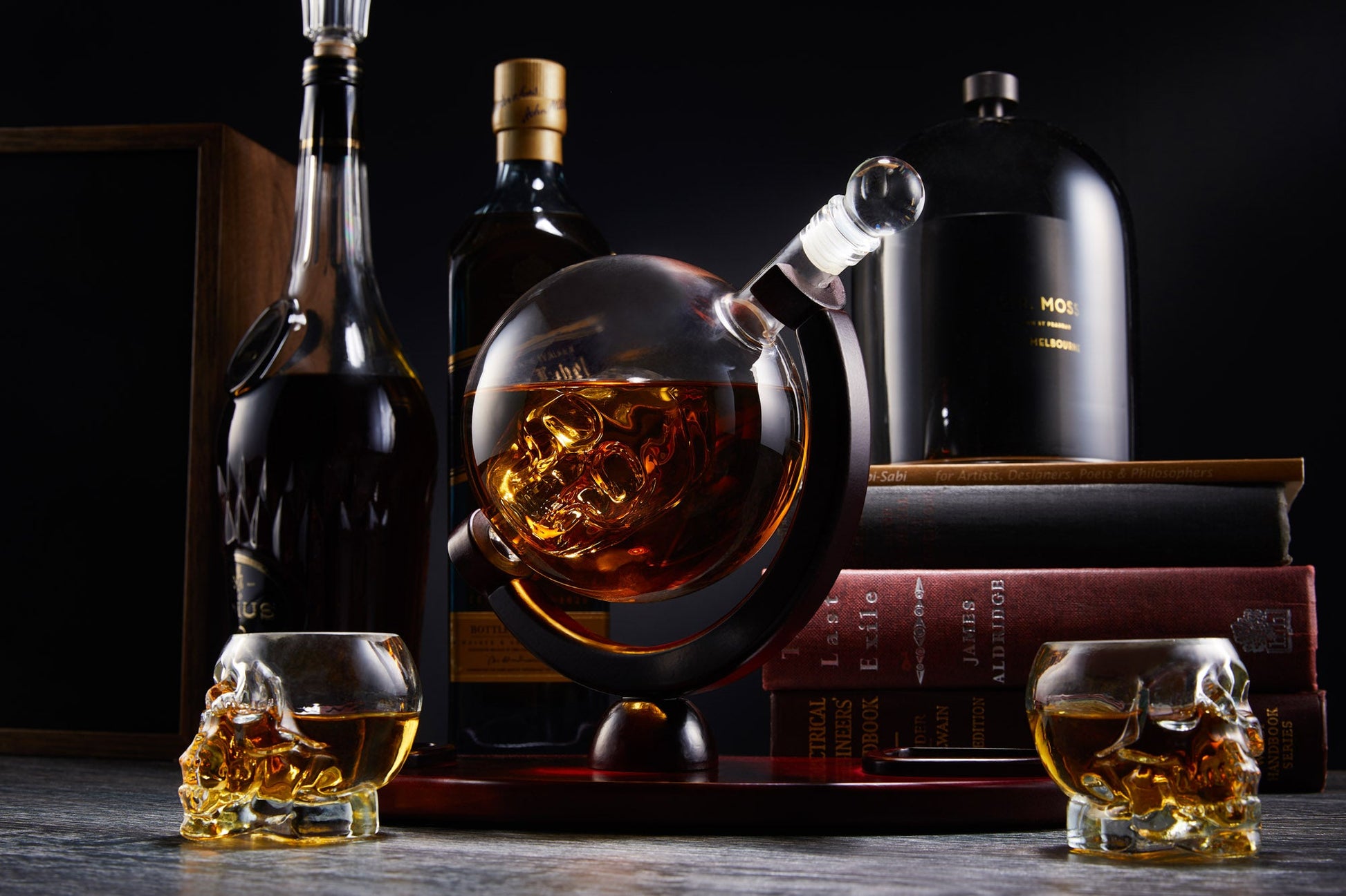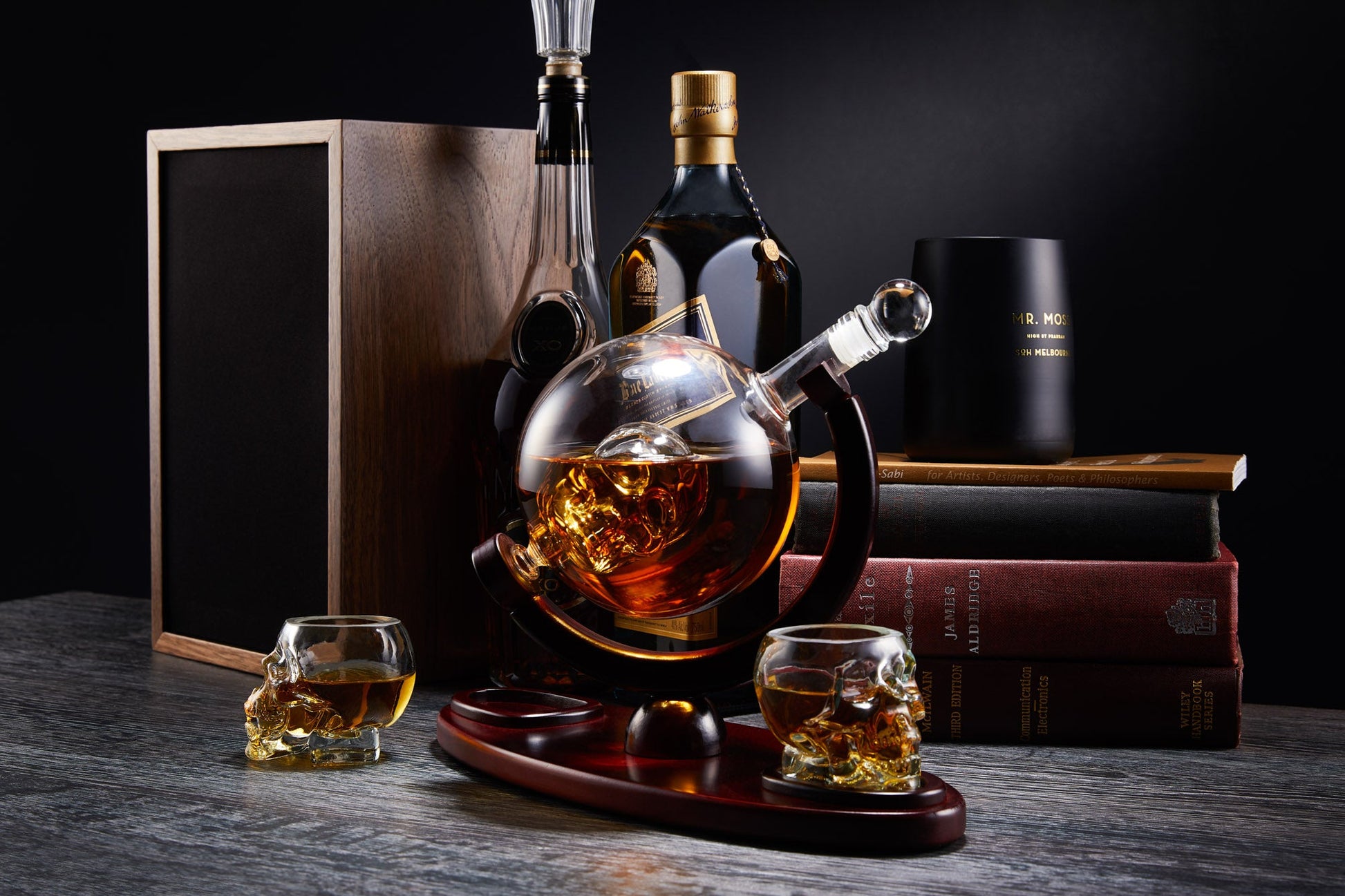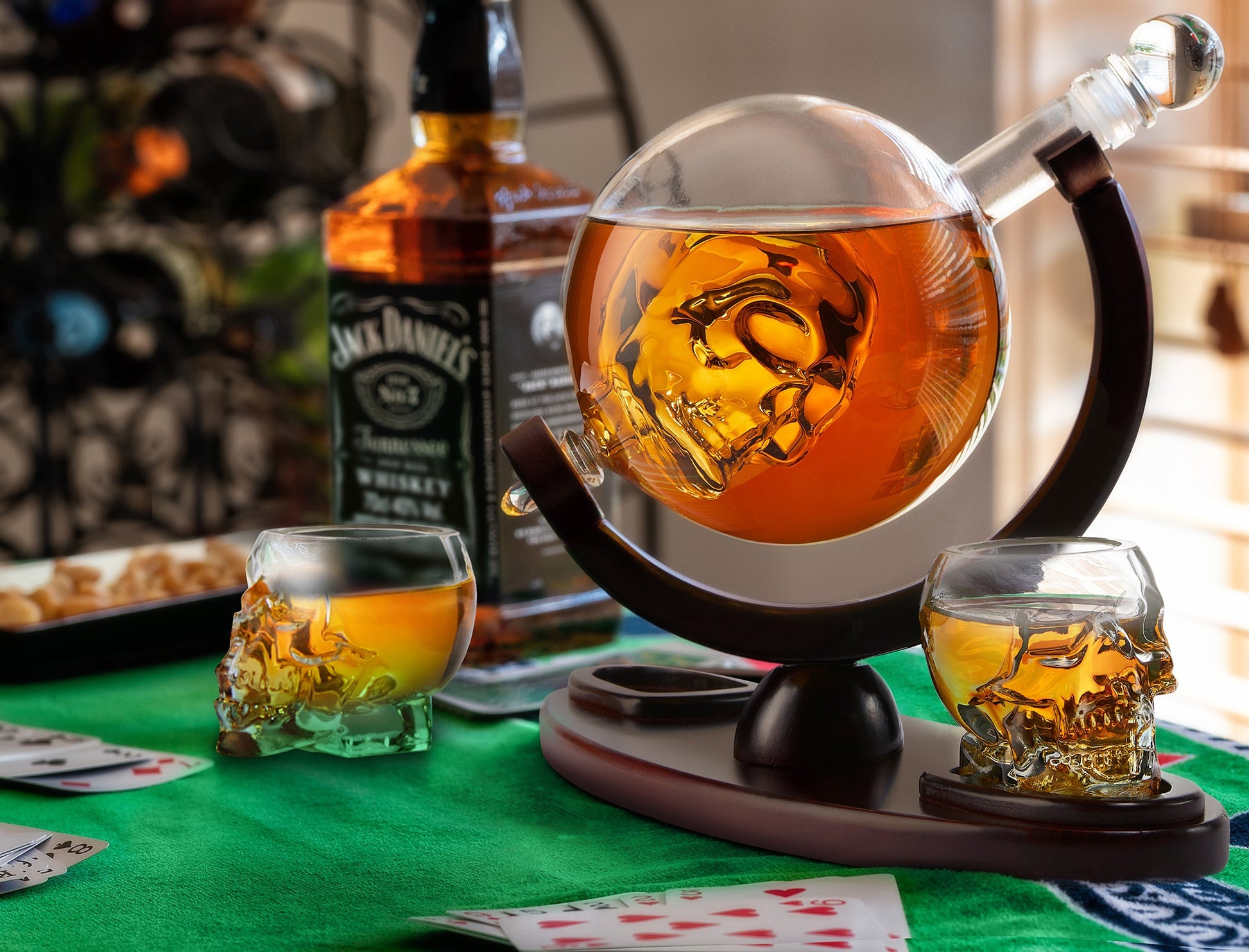 - Entirely hand-crafted and includes a Large whiskey decanter with Skull inside, gorgeous premium giftbox, rustic wooden display shelf, two skull shaped whiskey glasses, pouring funnel and a glass stopper to keep your whiskey fresh