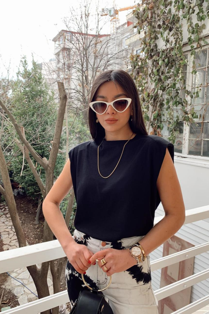 This black cotton tank top is your low maintenance, high-impact go to featuring a modern take on the classic muscle shirt, with wide armholes, round neckline, and padded shoulders.