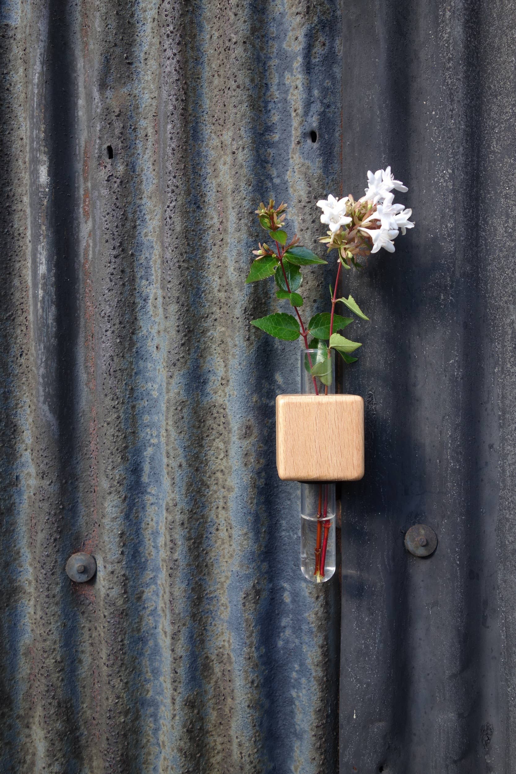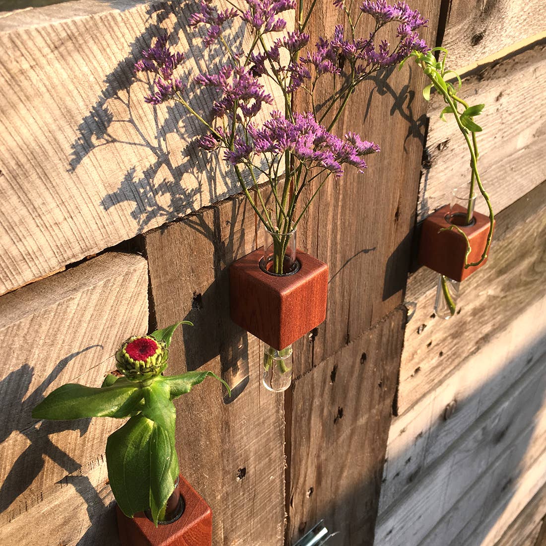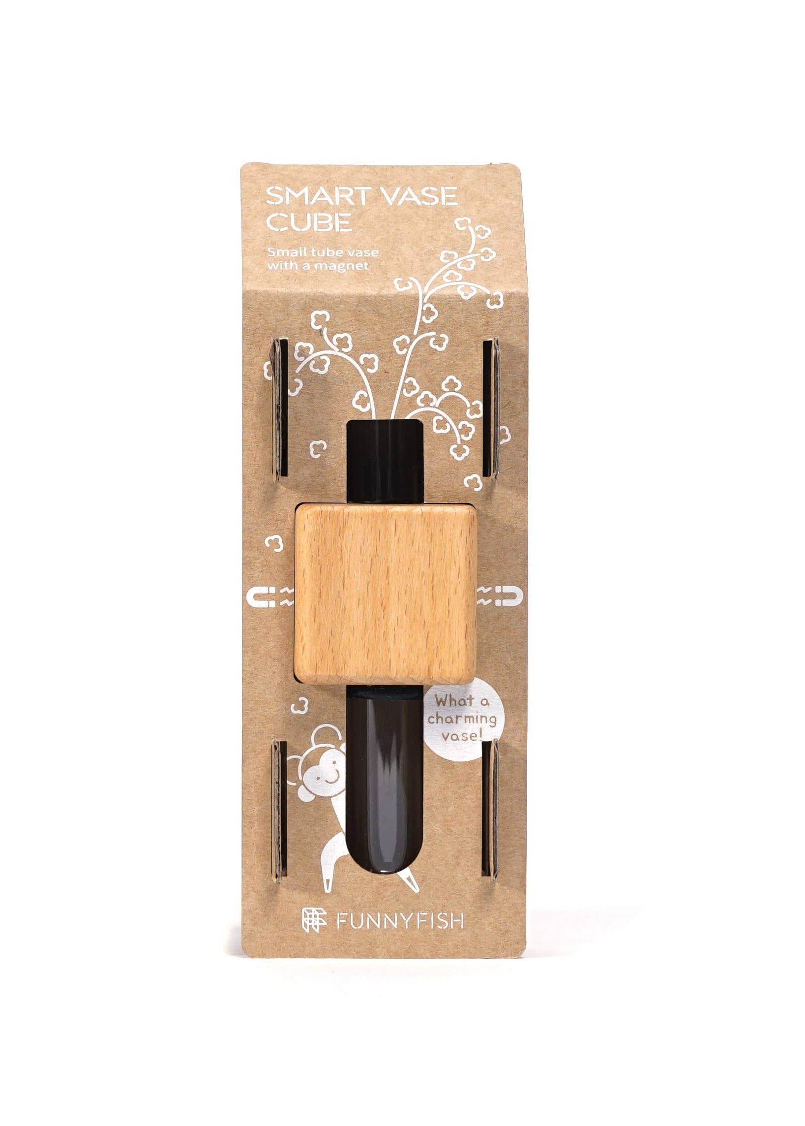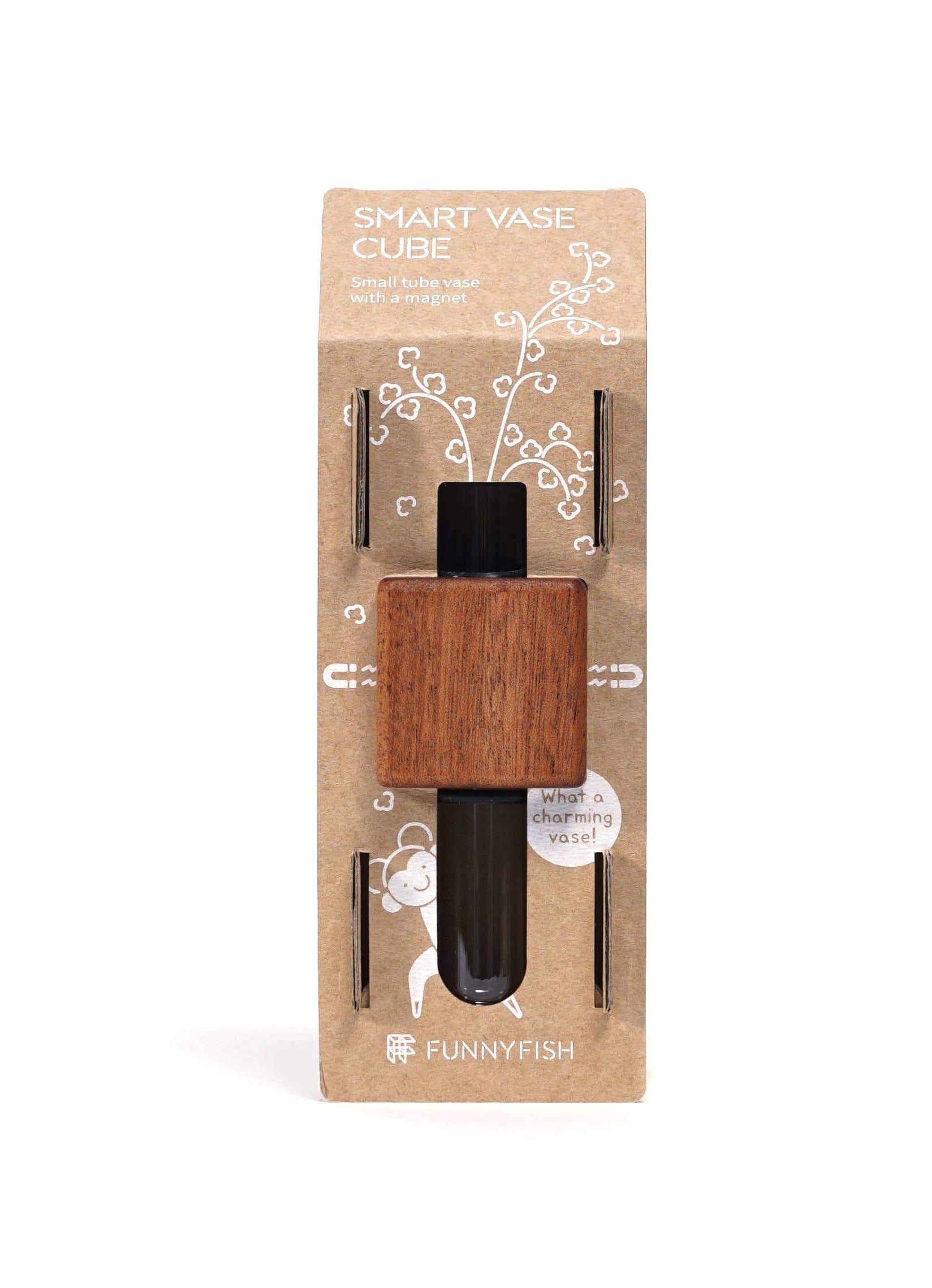 This is a small propagation vase that is perfect to double as a decorative piece in your home. The cube is made from natural wood, and fits with the clear plastic vase. A magnet is embedded in the wooden cube, so you can put it on any magnetic surface like a fridge door.