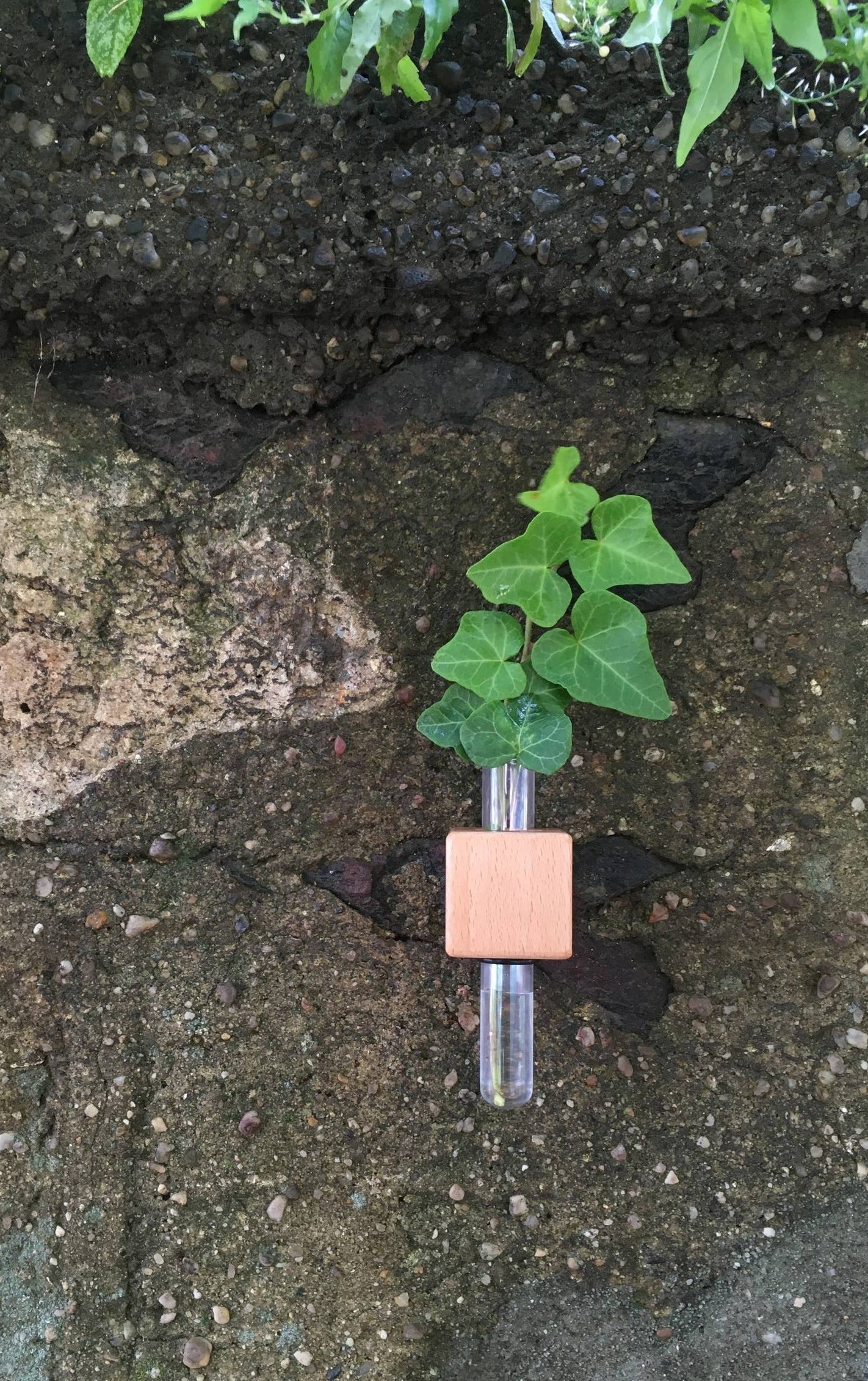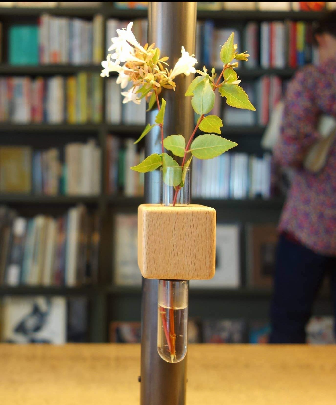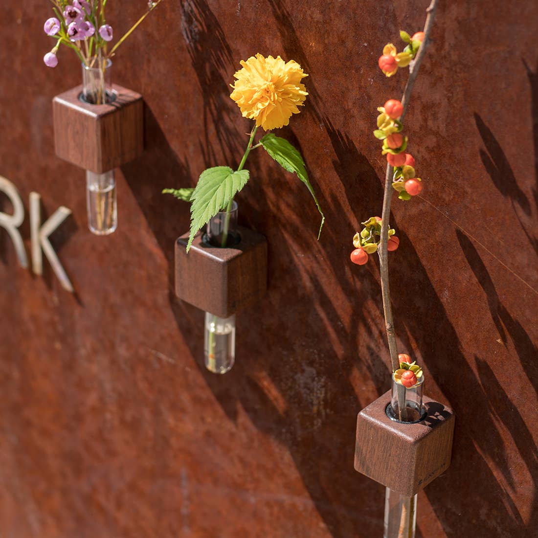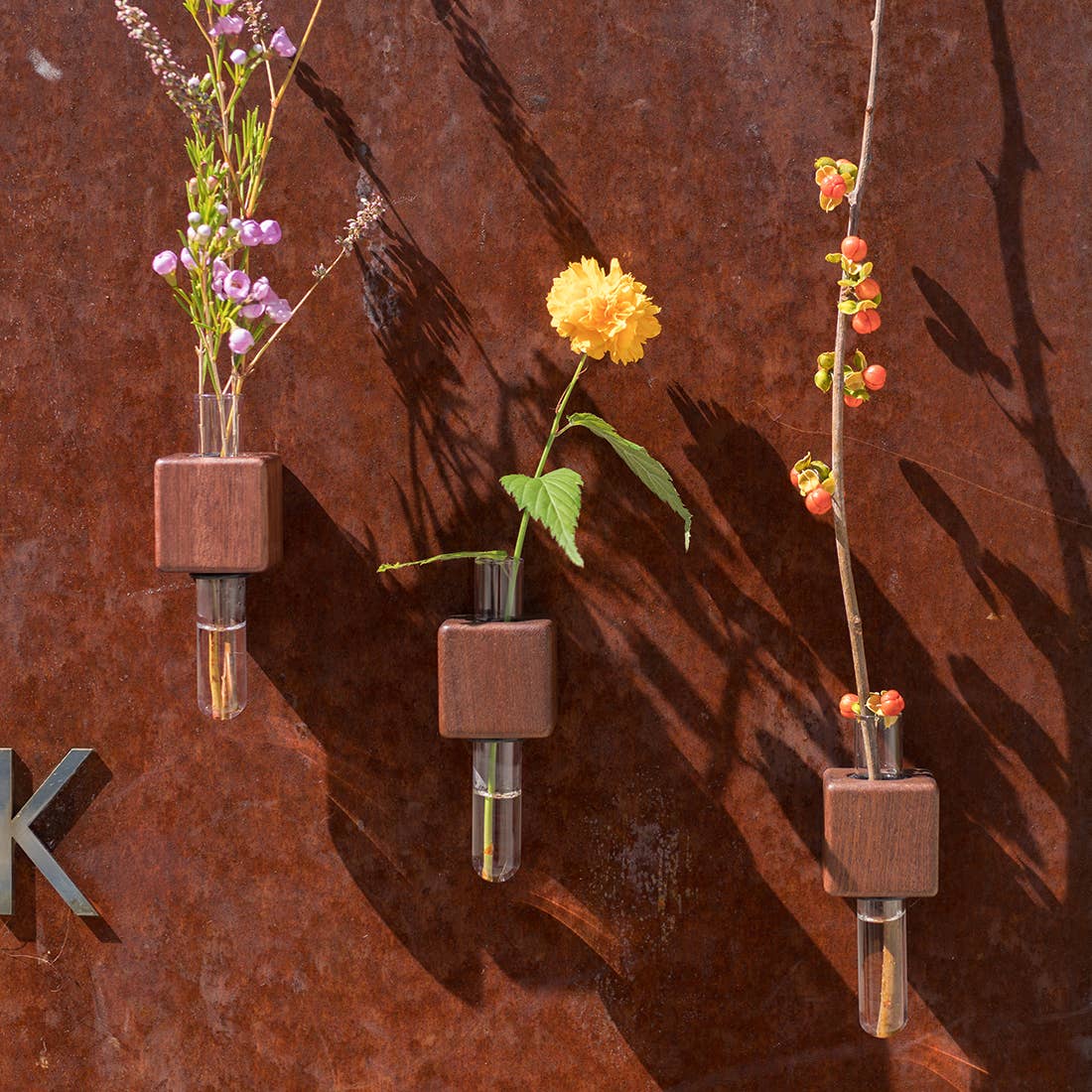 This is a small propagation vase that is perfect to double as a decorative piece in your home. The cube is made from natural wood, and fits with the clear plastic vase. A magnet is embedded in the wooden cube, so you can put it on any magnetic surface like a fridge door.