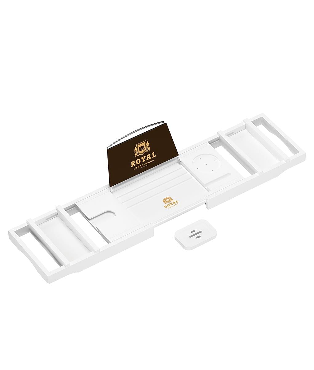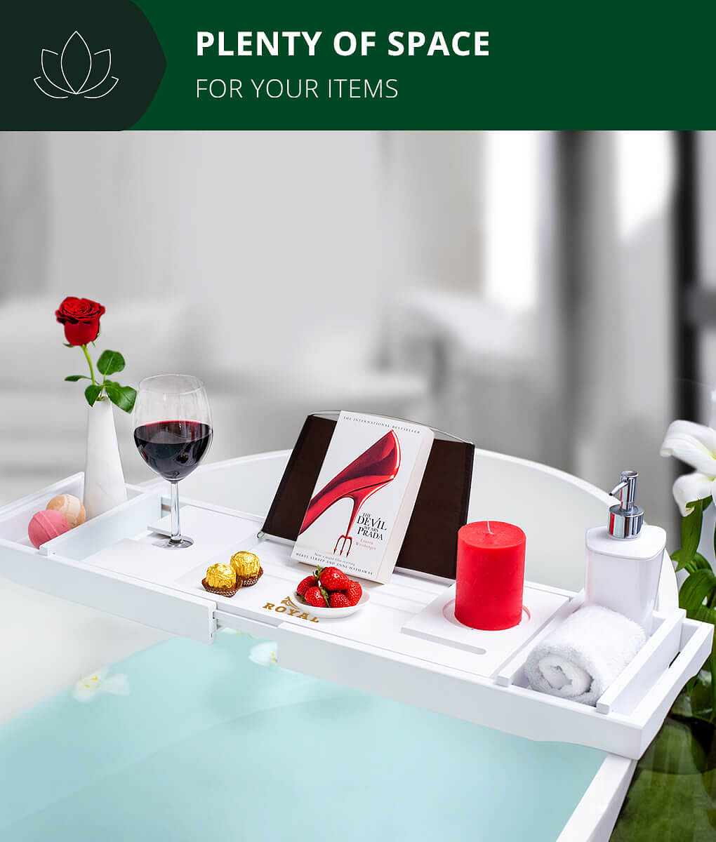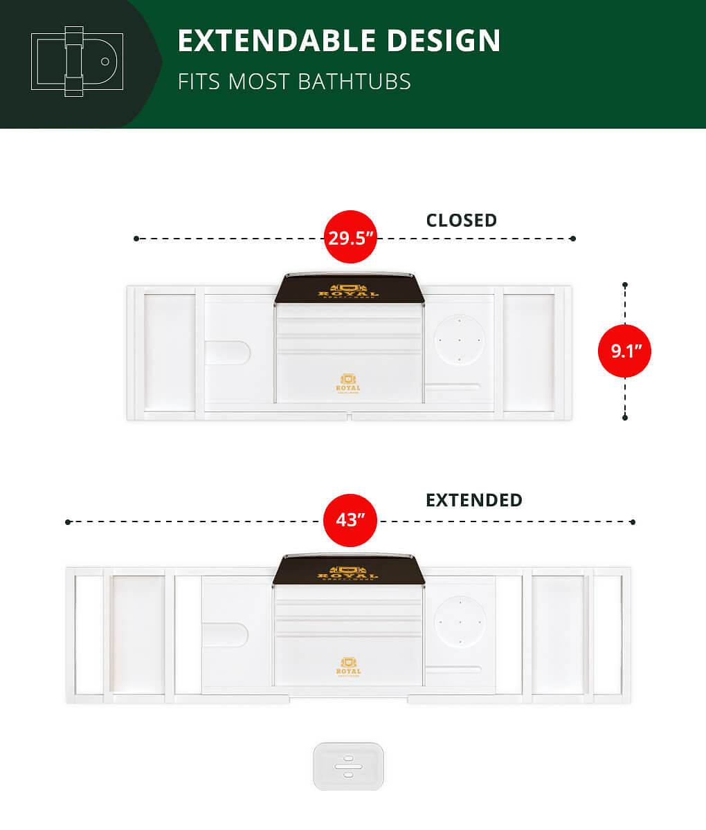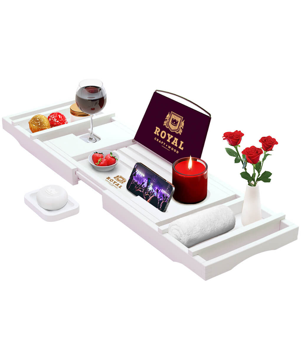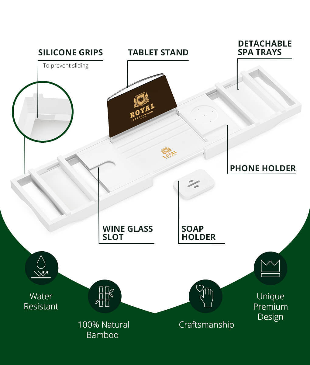 ADJUSTABLE AND SLIP-RESISTANT: Strategically designed with high-quality craftsmanship and skilled artisans to accommodate most bathtubs on the market. This white bathtub caddy tray is extendable in nature to fit tub dimensions ranging anywhere from 29 ½” to 43" and is lined with a secured silicone gripped bottom to ensure it stays in place as you relax.