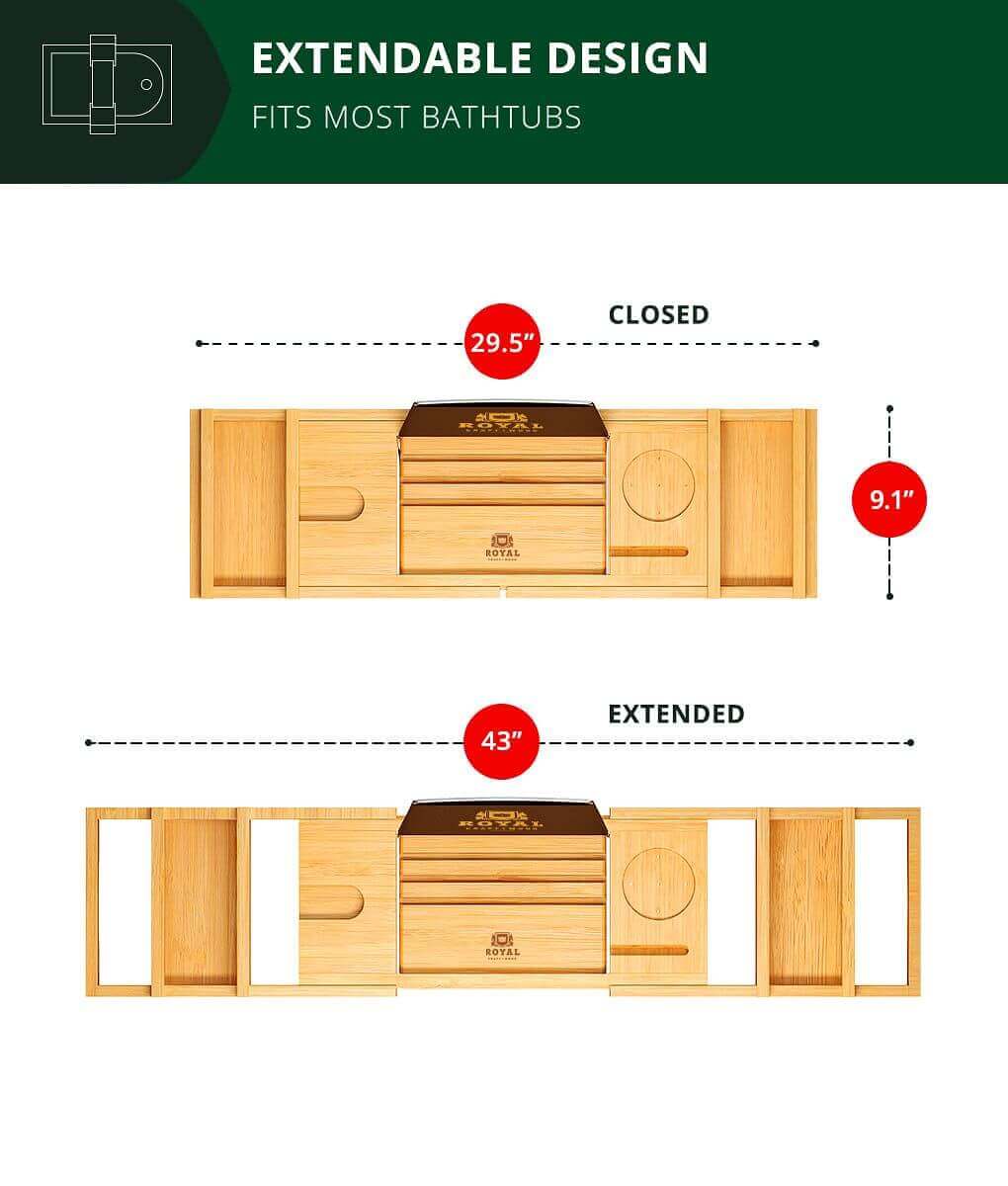 - Our bamboo bath tray was professionally engineered to be able to expand from 29" 1⁄2" to 43" to sit and fit perfectly even in the widest bath and never slip with durable-designed finest non-slip silicone pads